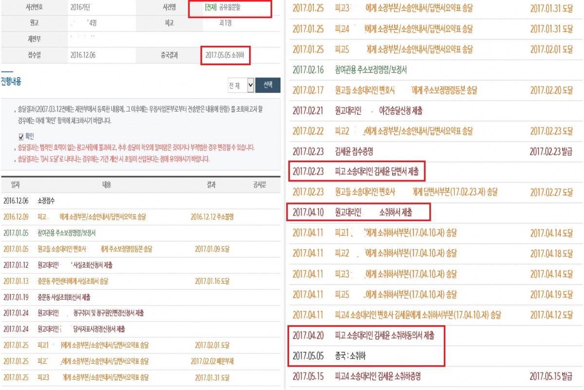 결국 상대방들은 저희 법률사무소 헌율의 주장을 받아들여 제기한 소를 취하하였고, 이로써 사건은 마무리 되었습니다.