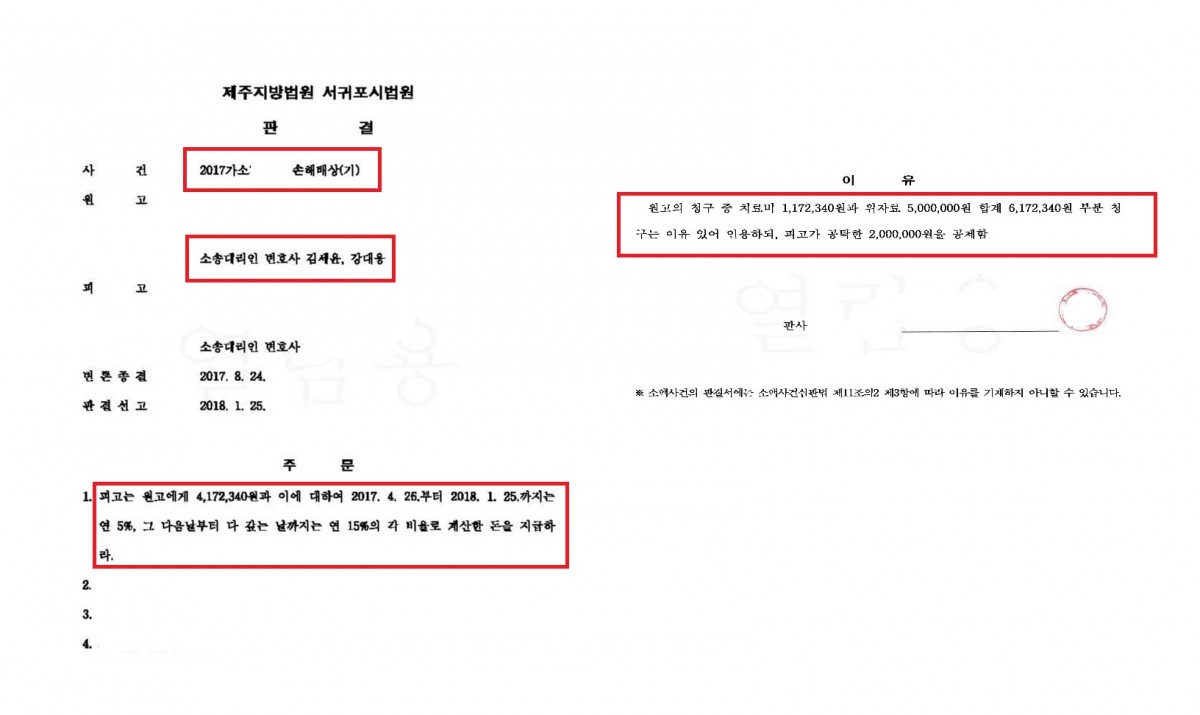 이에 재판부는 저희 법률사무소 헌율의 주장이 타당하다고 판단하였고, 상대방이 의뢰인에게 치료비와 위자료를 지급하라는 판결을 선고하였습니다.