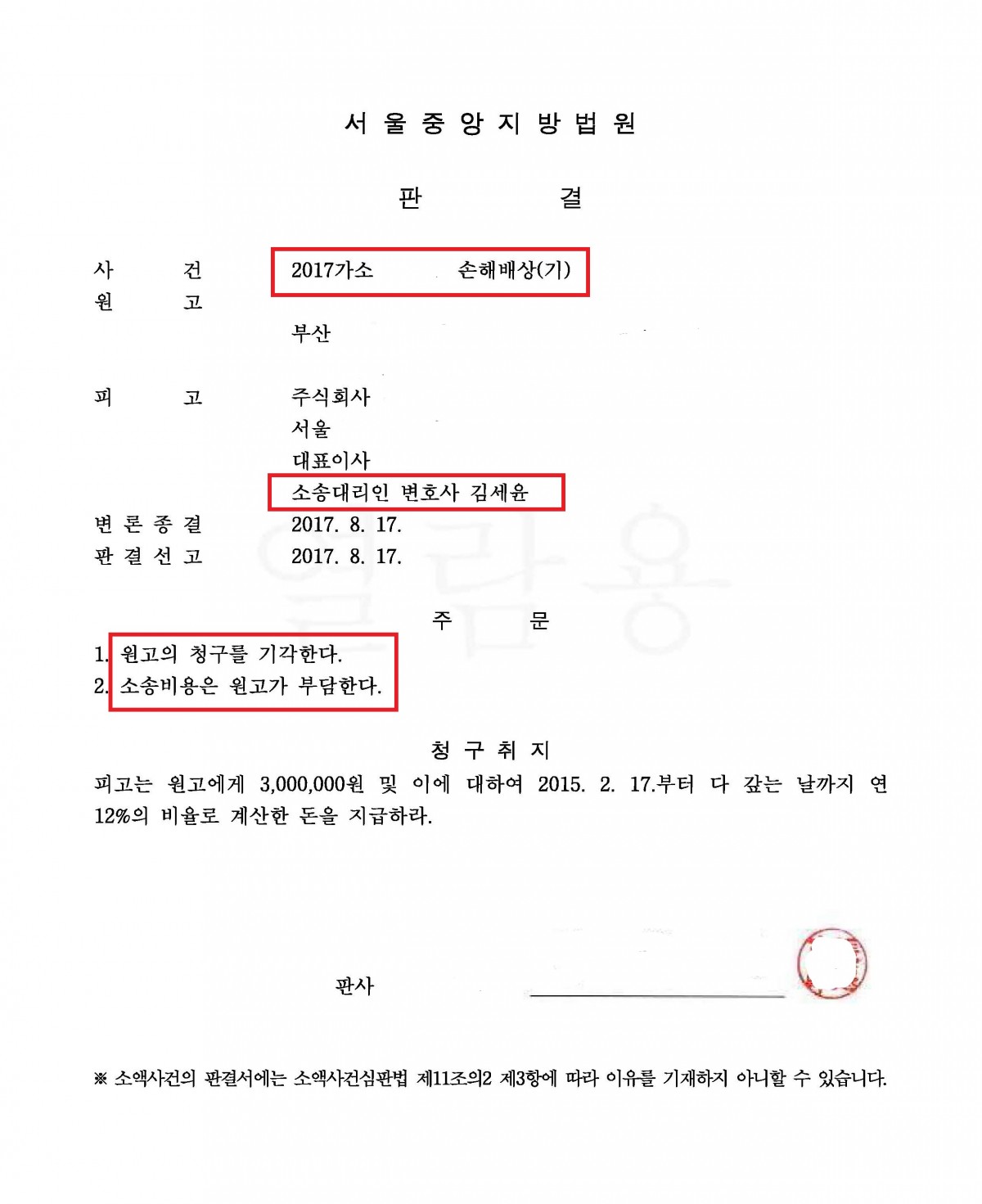 재판부는 저희 법률사무소 헌율의 주장이 타당하다고 판단하였고, 결국 상대방(원고)의 청구를 기각하였습니다.