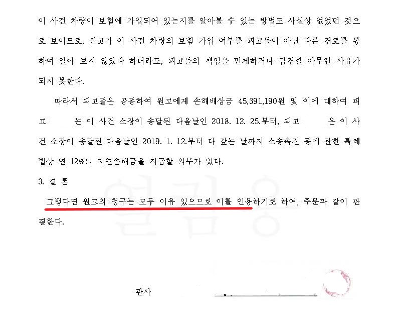 민사소송 | 손해배상사건) 차량을 보험에 가입하지 않았음에도 가입하였다고 하면서 매도한 상대방에 대하여 의뢰인의 교통사고로 인하여 발생한 손해배상금인 45,931,190원을 청구하여 전부 승소한 사례