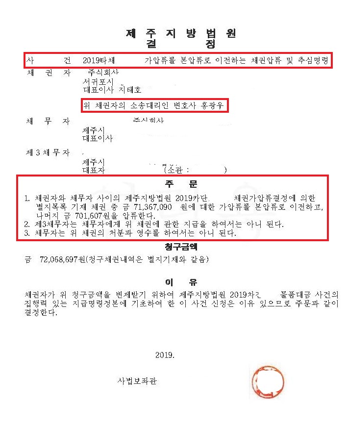민사소송 | 71,068,697원에 대한 가압류를 본압류로 이전하는 채권압류 및 추심명령 인용 사례