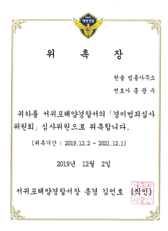 서귀포해양경찰서장은 2019. 12. 2. 홍광우 변호사를 "경미범죄심사위원회" 심사위원으로 위촉하였습니다.