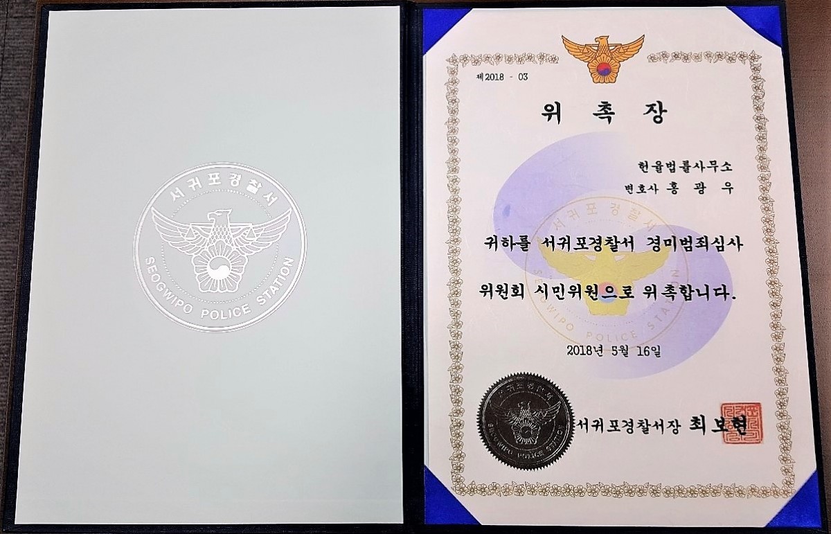 서귀포 경찰서장은 홍광우 변호사를 서귀포경찰서 경미범죄심사 위원회 시민위원으로 위촉하였습니다.