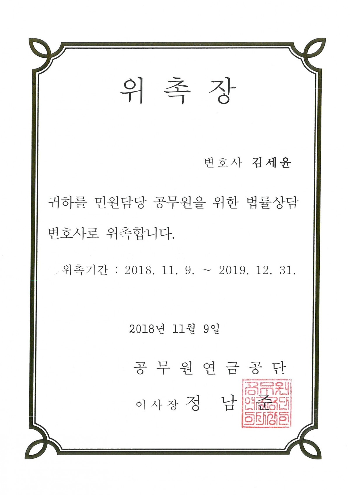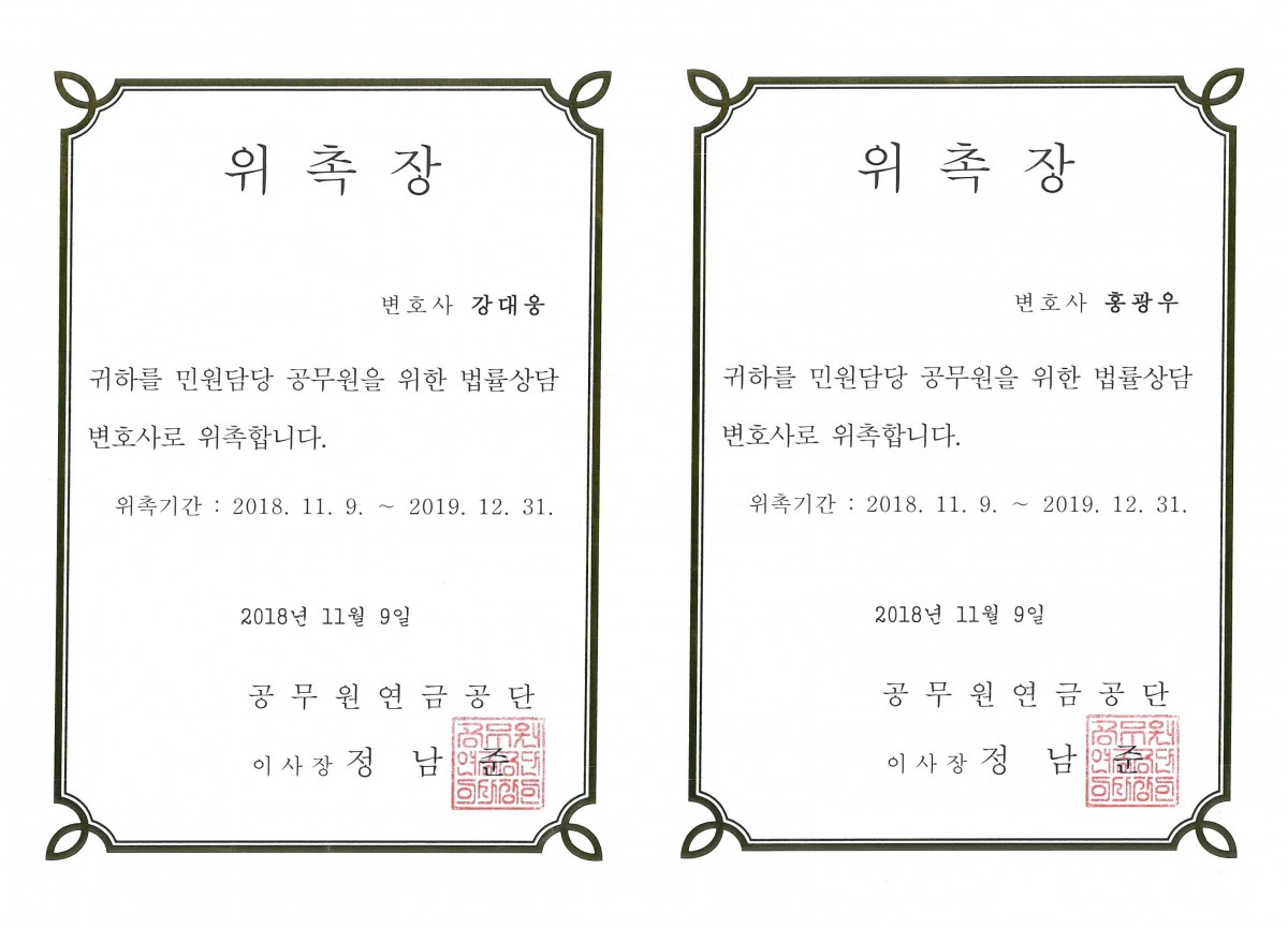 공무원 연금공단 이사장 정남준은 2018. 11. 9. 법률사무소 헌율의 김세윤 변호사, 강대웅 변호사, 홍광우 변호사를 민원 담당 공무원을 위한 법률상담 변호사로 위촉하였습니다.