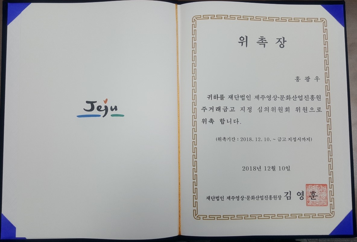 재단법인 제주영상 및 문화산업진흥원장 김영훈은 2018. 12. 10. 홍광우 변호사를 심의위원회 의원으로 위촉하였습니다.
