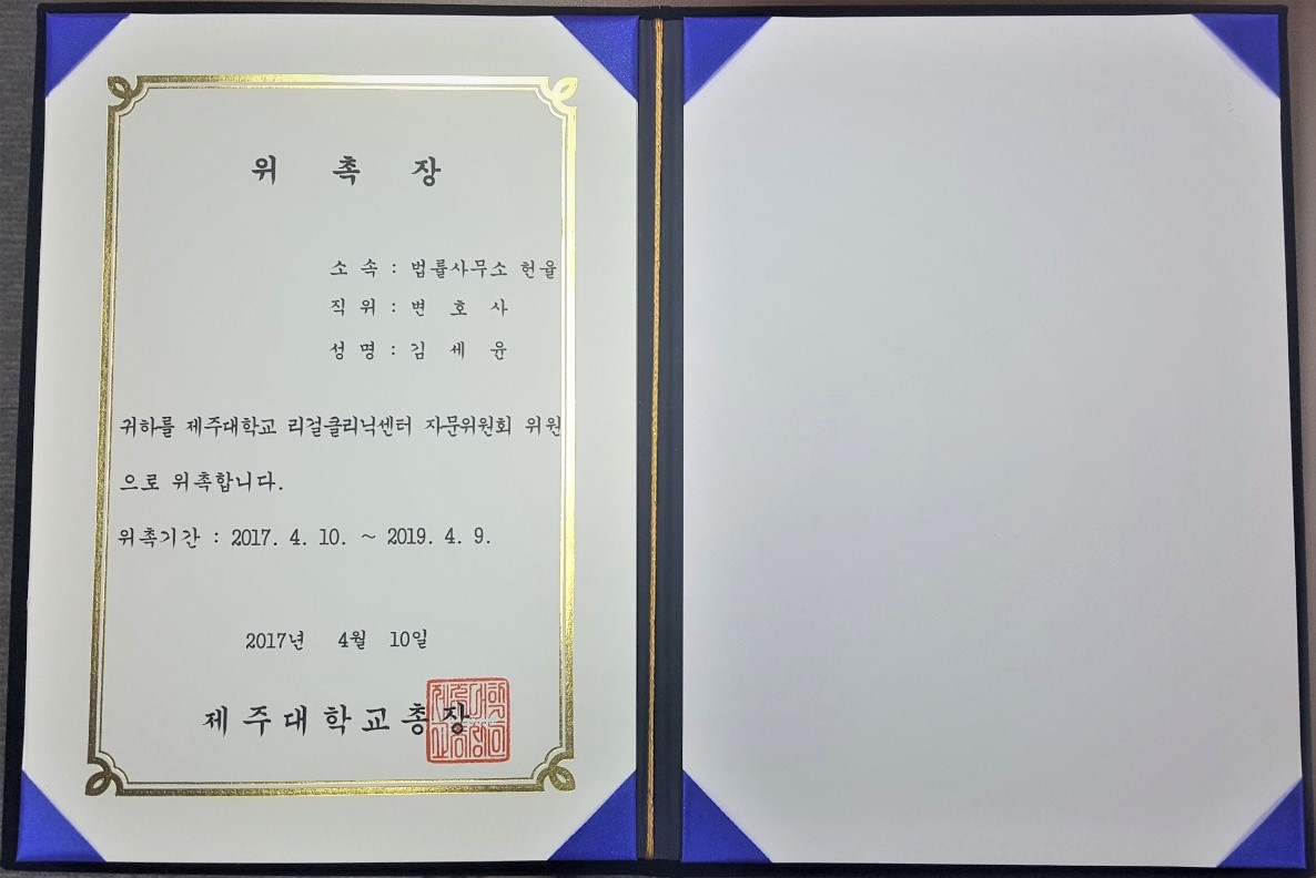 제주대학교에서는 김세윤 변호사를 2017. 4. 10.부터 2019. 4. 9.까지 리걸클리닉센터 자문위원회 위원으로 위촉하였습니다.